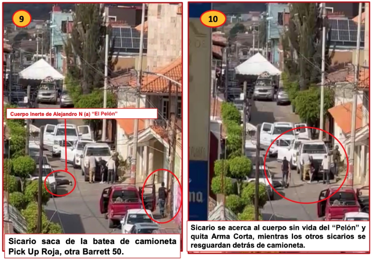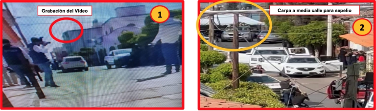 En la primera de las láminas mostradas en la intervención del funcionario de seguridad, se identificó el lugar donde la persona que tomó el video de la matanza captó el momento, mientras que en la segunda lámina, se identificó la ubicación del sepelio donde colocaron una carpa afuera de la casa de la familia de “El Pelón”, ahí se ve a los sicarios cubrirse detrás de varios autos de lujo.