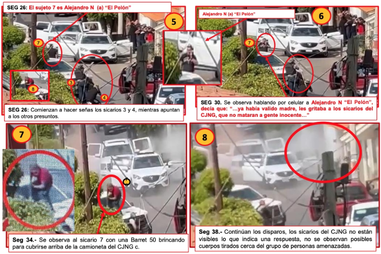 Según la SSPC, mientras hablaba por teléfono, el “El Pelón” decía que: “ya había valido m****, les gritaba a los sicarios del CJNG que no mataran a gente inocente”, indicó la SSPC. En ese momento, el sicario 7 sostiene una arma Barret 50 y brinca arriba de una camioneta del CJNG para cubrirse.