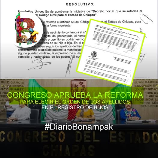 El Congreso del Estado de Chiapas aprobó una reforma al artículo 58 del Código Civil que permitirá a madres y padres elegir, de común acuerdo, el orden de los apellidos al momento de registrar a sus hijos en la entidad.De acuerdo con la modificación avalada, a partir de su entrada en vigor, las parejas podrán decidir si el primer apellido que llevará el menor será el de la madre o el del padre. Esta medida busca reconocer la igualdad entre ambos progenitores en el proceso de registro civil.No obstante, la reforma establece que en caso de no existir acuerdo entre los padres, será el apellido del padre el que tenga prioridad en el acta de nacimiento.Asimismo, el decreto señala que todos los hijos de una misma familia deberán conservar el mismo orden de apellidos, con el fin de garantizar certeza legal, continuidad documental e identidad familiar.