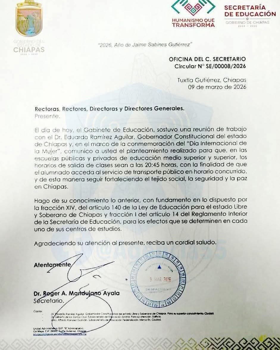 El gabinete de la Secretaría de Educación propuso que estudiantes de educación media superior y superior en Chiapas concluyan sus actividades escolares a más tardar a las 20:45 horas.